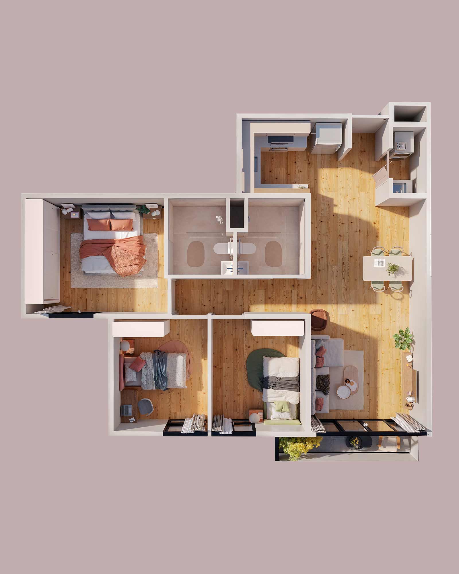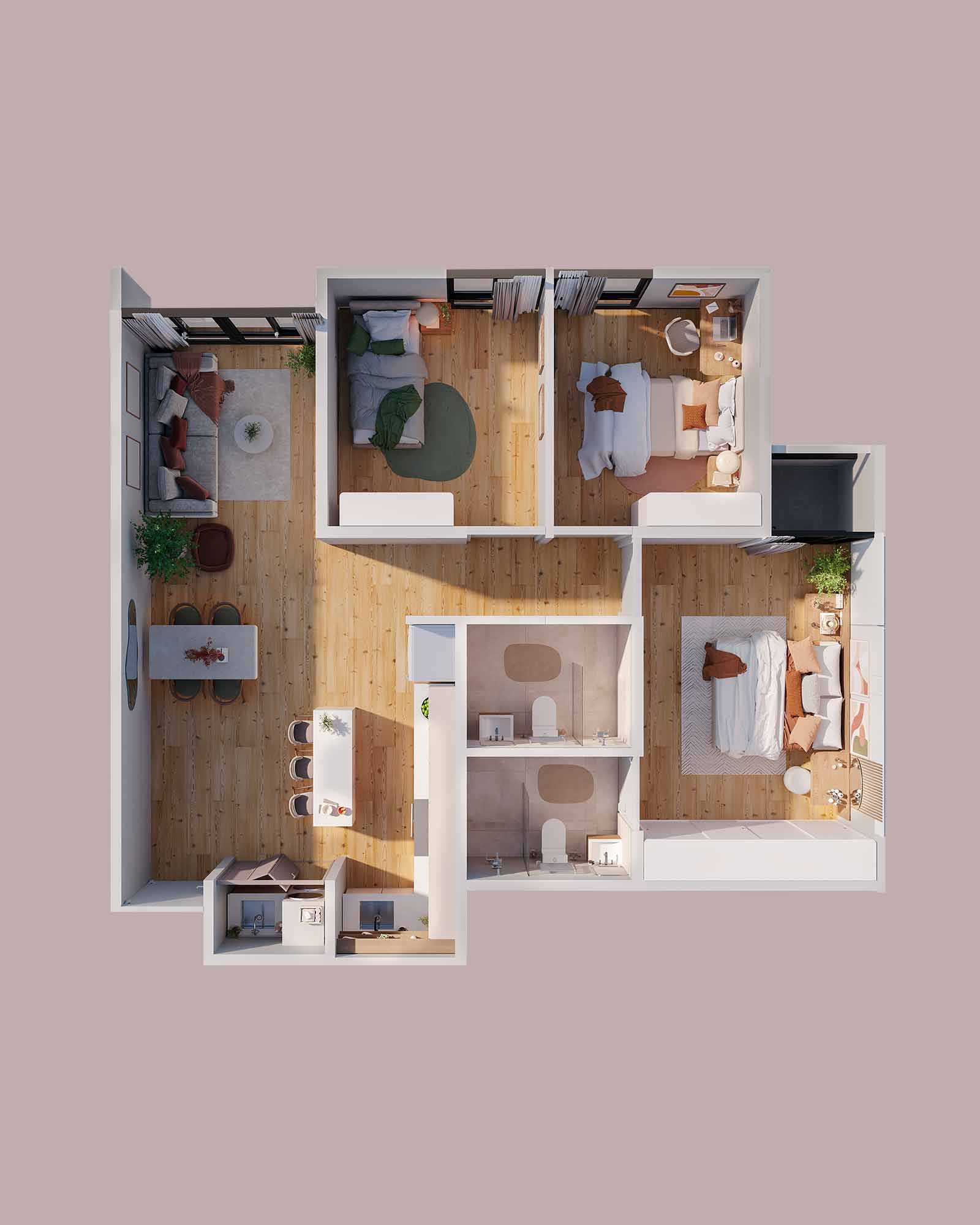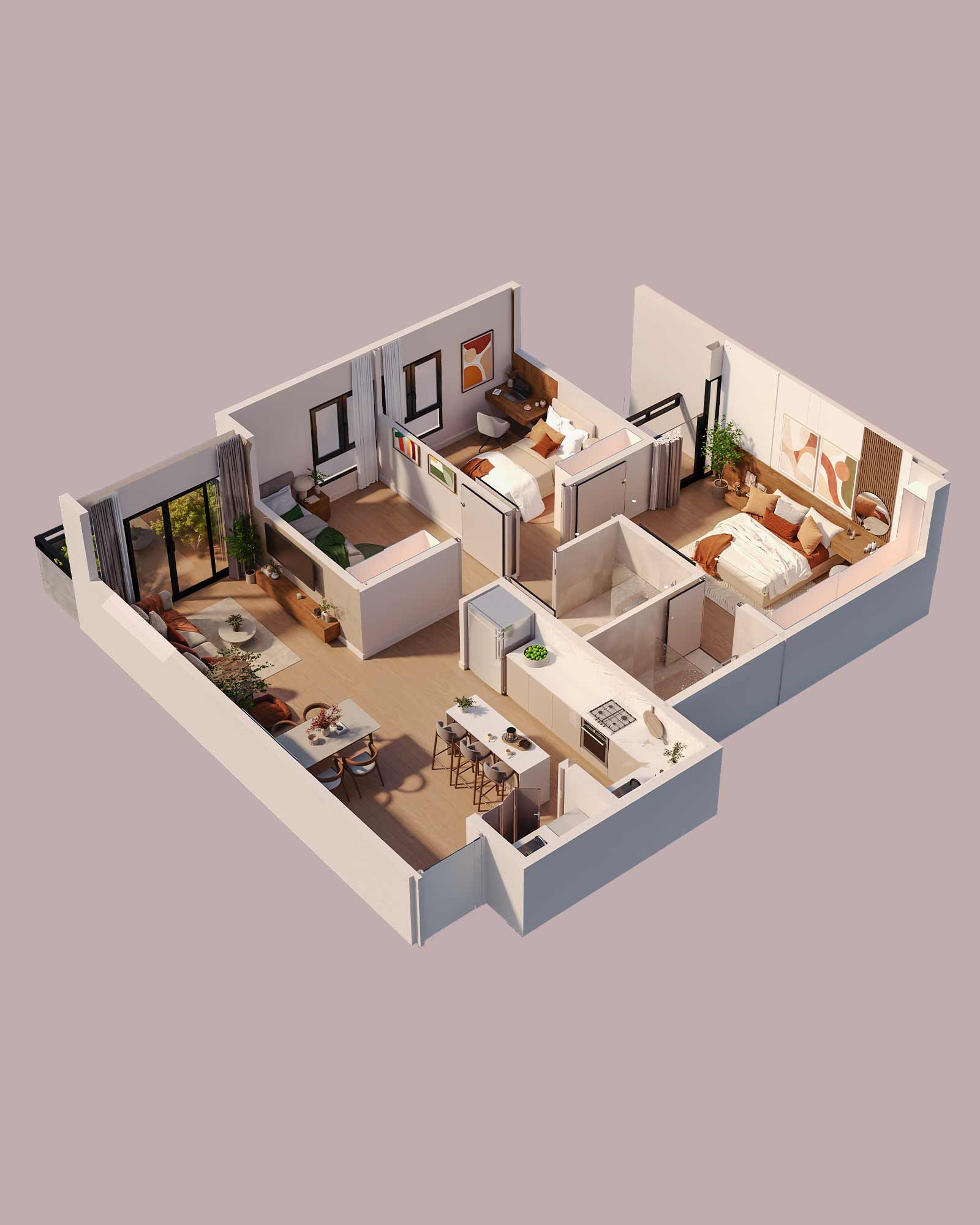 Resolvimos las oportunidades de mejora de los diseños tradicionales de torres. Por eso, cada apartamento cuenta con una cocina amplia, un cuarto de lavado con pila incluida y balcones con amplia vista a la naturaleza.